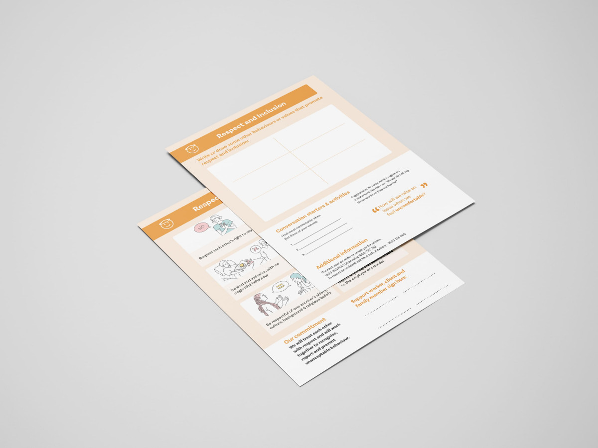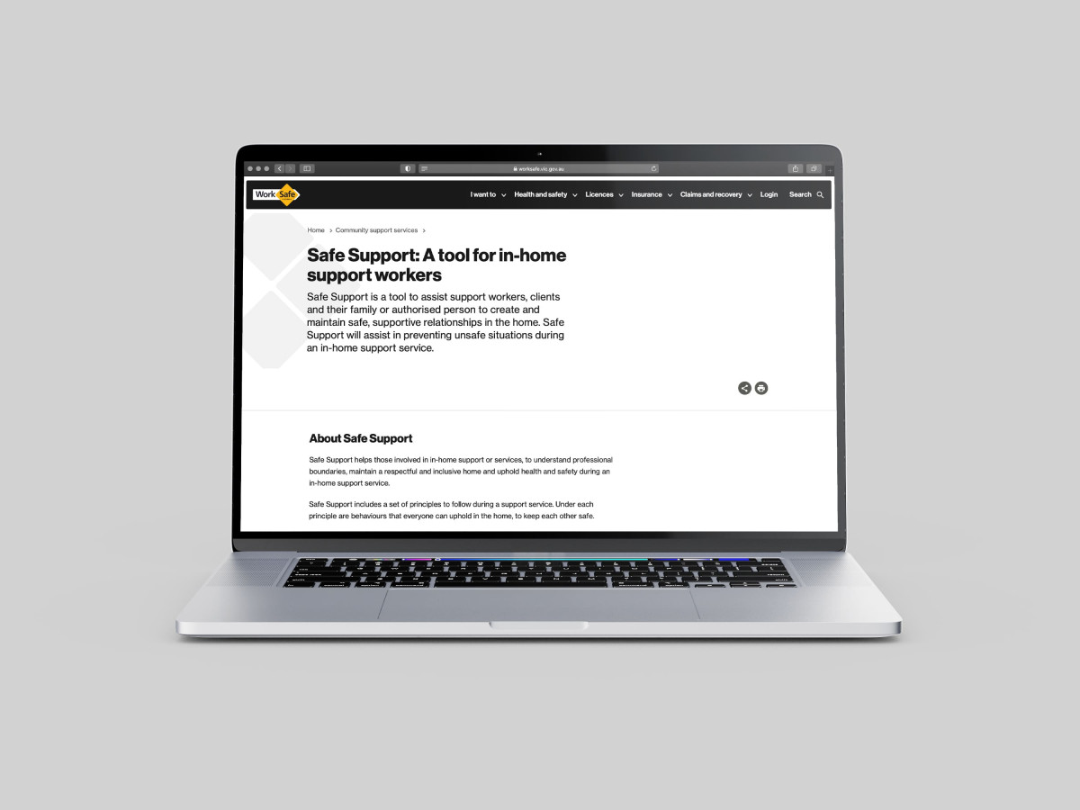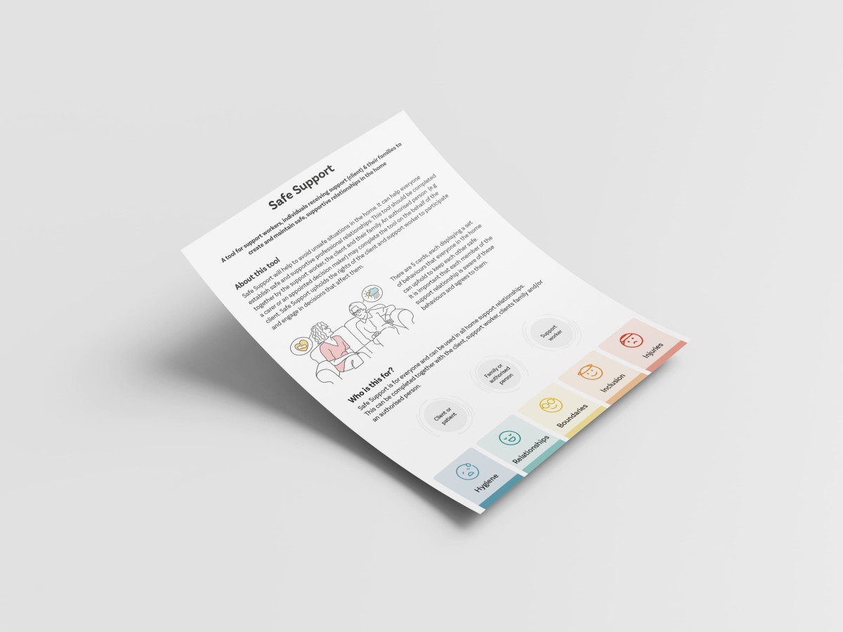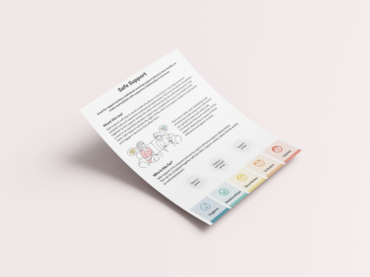 Safe Support is a tool designed to prevent injuries during an in-home support service. A collection of principles in a set of interactive cards, this tool enables workers, clients and their families to discuss and record what is important to their safety. Once in agreement, each party signs their commitment to practising safe behaviours.