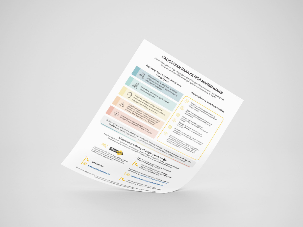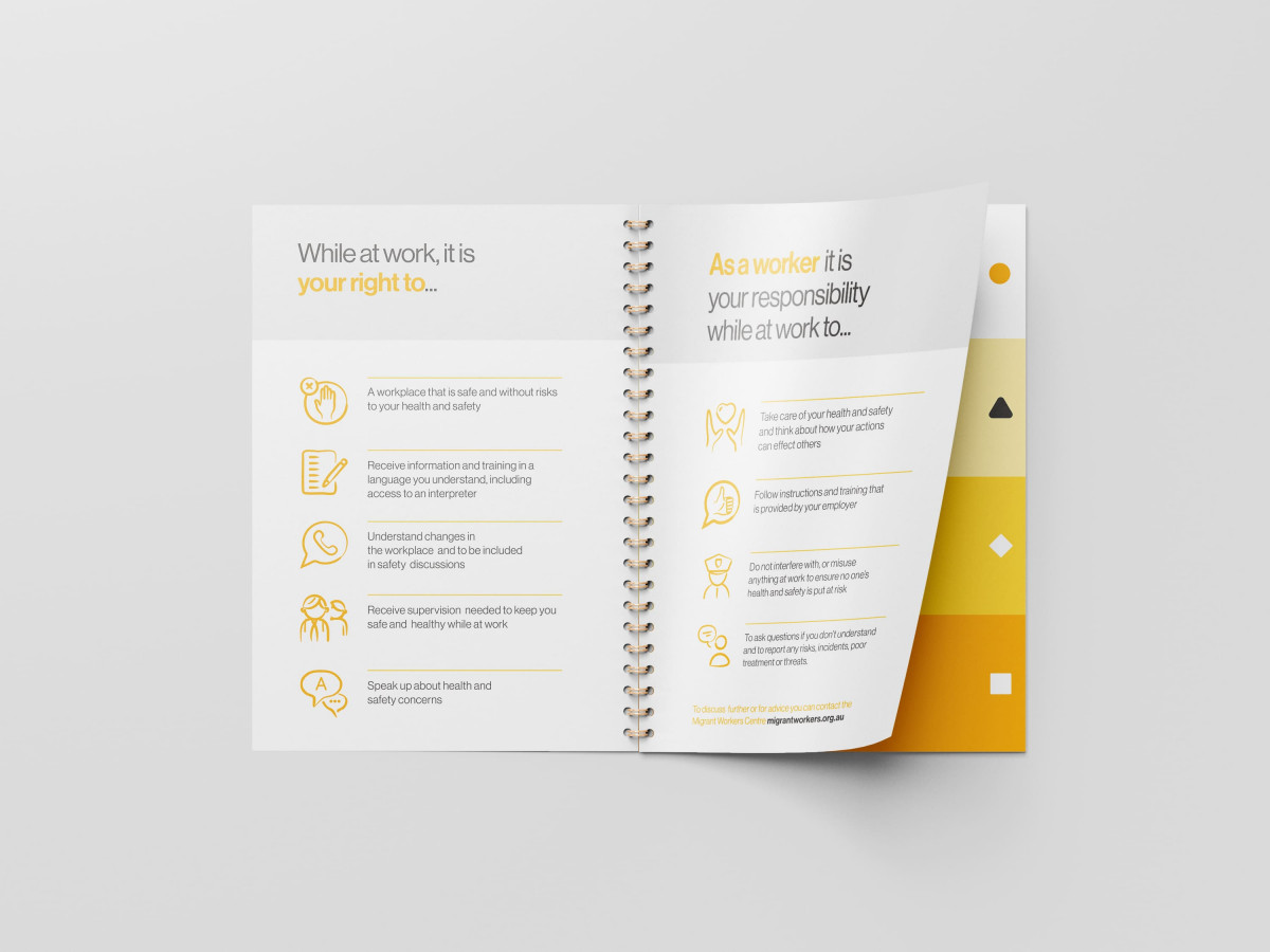The Starter Kit provides clear, simple information on workers’ rights and responsibilities, equipping them with information to stay safe at work and prevent injury. It is designed for community service organisations and leaders to distribute into their communities.